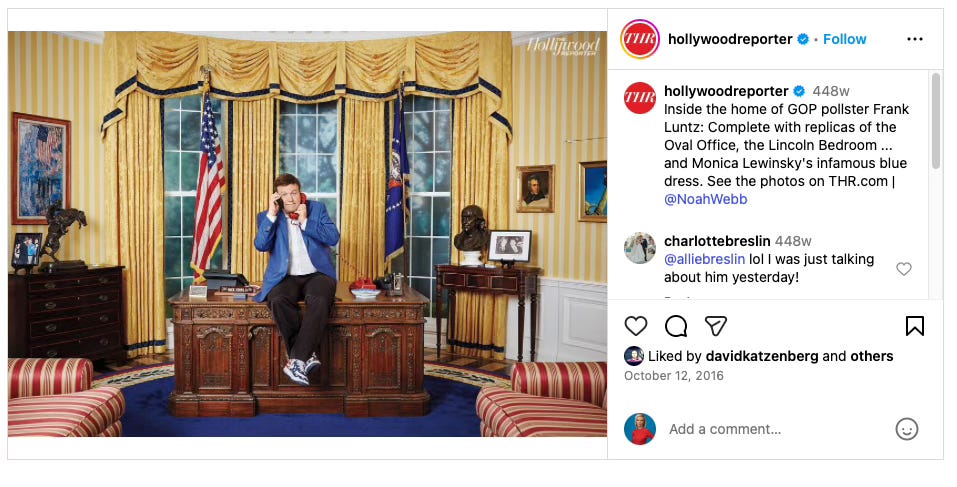 I've actually been to Luntz's Los Angeles home, attending an Axios event he hosted after I moved to California. The experience was surreal. Outside sat a statue of President Obama, the guy I worked for, greeting visitors. Inside, Luntz’s house was meticulously decorated with presidential memorabilia — Air Force One M&Ms, White House paraphernalia — items that most former staffers like me shove into boxes. But the true monument to his political influence was his construction of full size replicas of the Oval Office, the White House bowling alley, and the Lincoln Bedroom. This elaborate shrine was built on profits made from sowing division, not progress.
