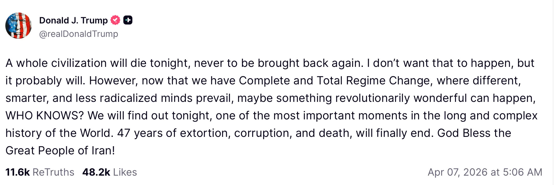 Just this morning, he suggested that “a whole civilization will die tonight.” I know we’ve become inured to this rhetoric by this point, but no President in US history would speak or communicate this way, even if it is a bluff.