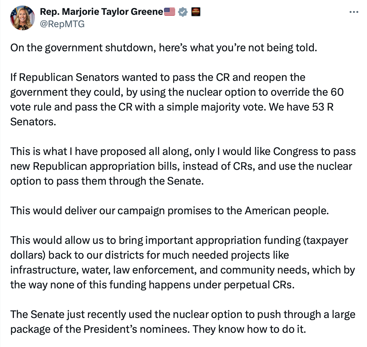 Representative Marjorie Taylor Greene suggested Senate Republicans use the nuclear option, override the 60-vote threshold with a simple majority, and reopen government with only Republican votes. It would shatter Senate precedent. The institution designed to force consensus would become another winner-take-all battlefield.